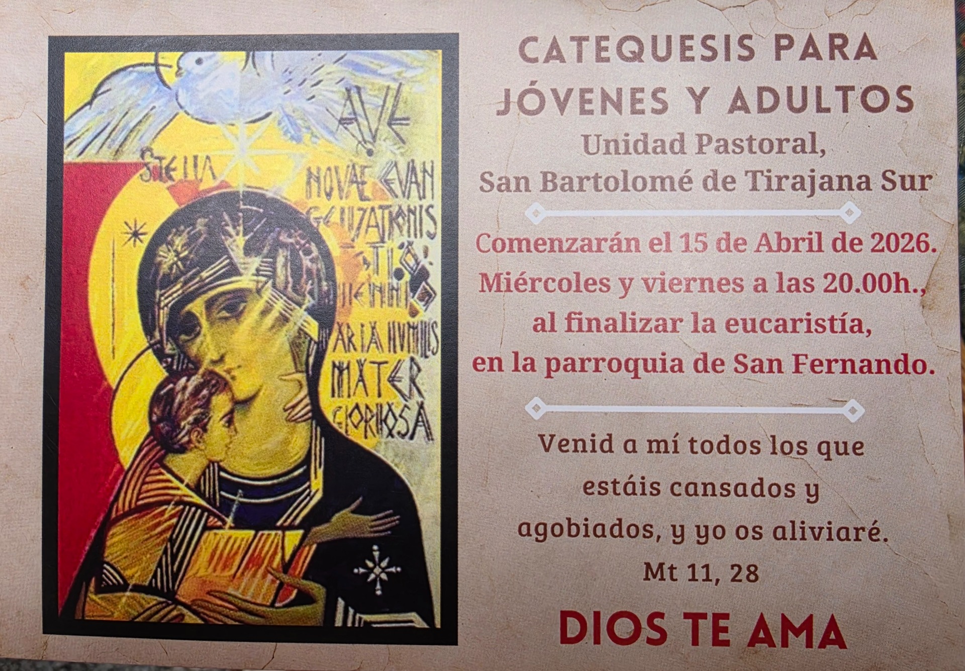 A partir del miércoles 15 de abril y hasta el 29 de mayo, los lunes y miércoles a las 20:00 en la parroquia de San Fernando, tendrán lugar una serie de Catequesis para jóvenes y adultos, abiertas a toda la unidad pastoral de San Bartolome de Tirajana y a todos los que anhelen una palabra de Vida.
