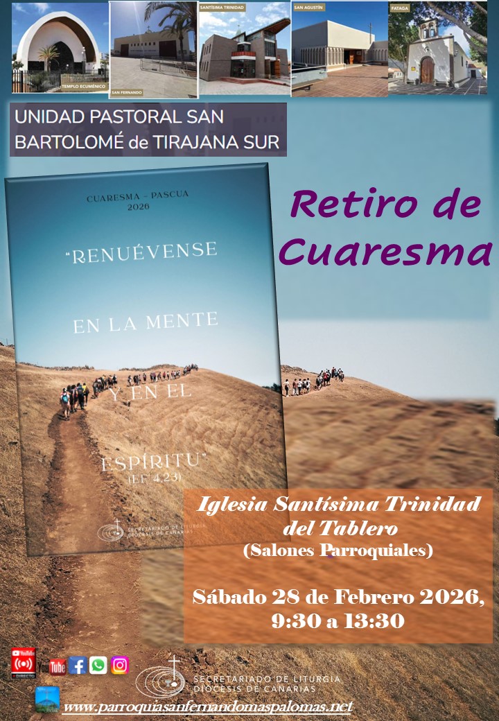 Volved a mí y yo volveré a vosotros —dice el Señor. Estas palabras del profeta Malaquias nos han acompañado en el día de hoy, en el Retiro de Cuaresma, de nuestra Unidad Pastoral, San Bartolome de Tirajana Sur, que hemos disfrutado, en esta ocasión, en el Tablero, en la iglesia de la Santísima Trinidad.