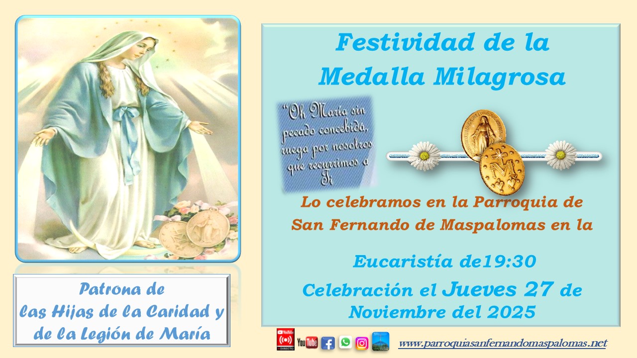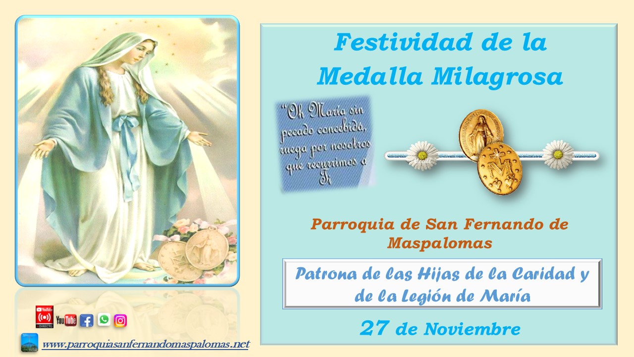Así nos lo recuerdan: El próximo miércoles, 27 de noviembre, 19:30, celebraremos una Solemne Eucaristía en honor a la Virgen Milagrosa, en nuestra parroquia de San Fernando.
