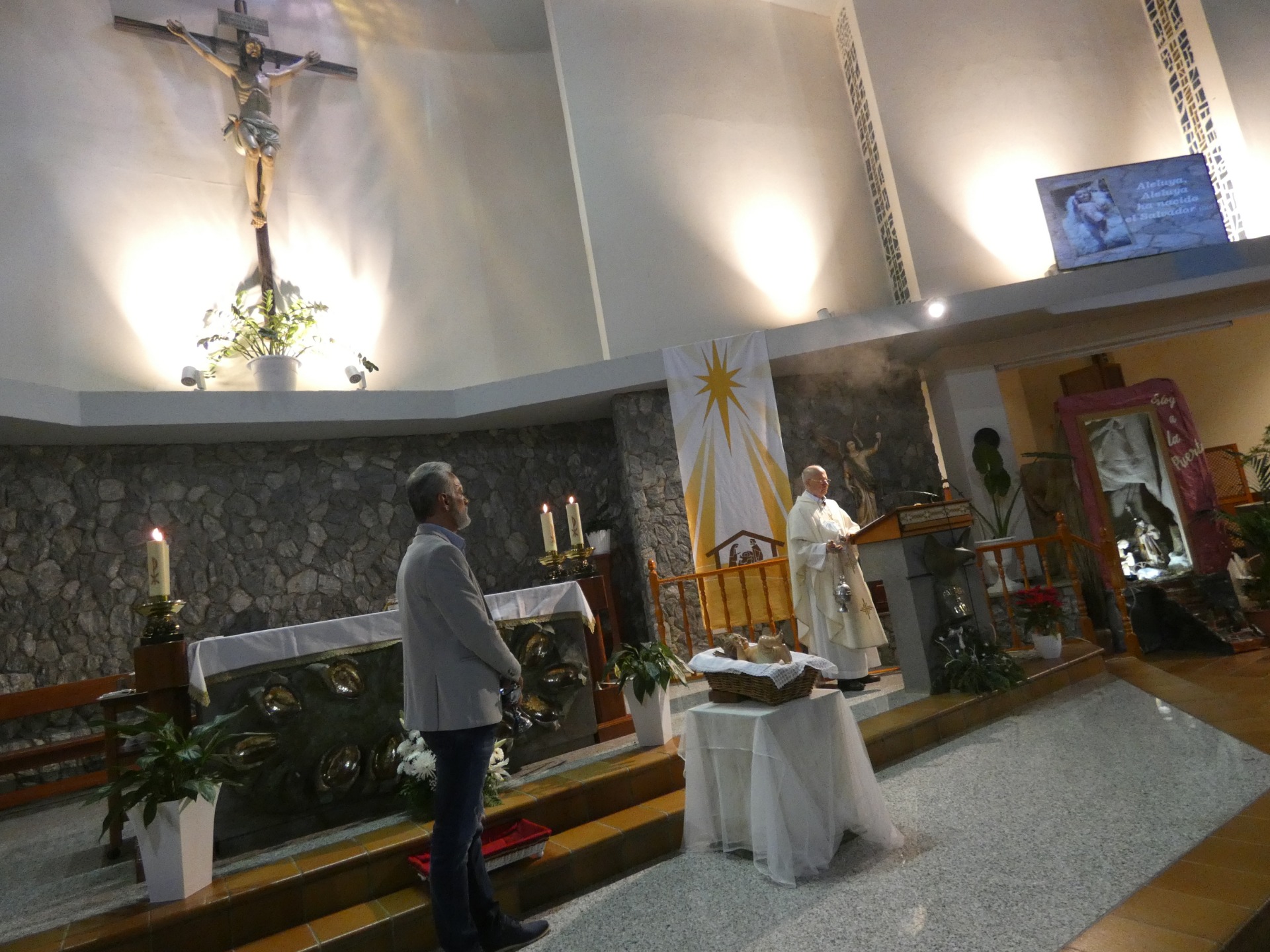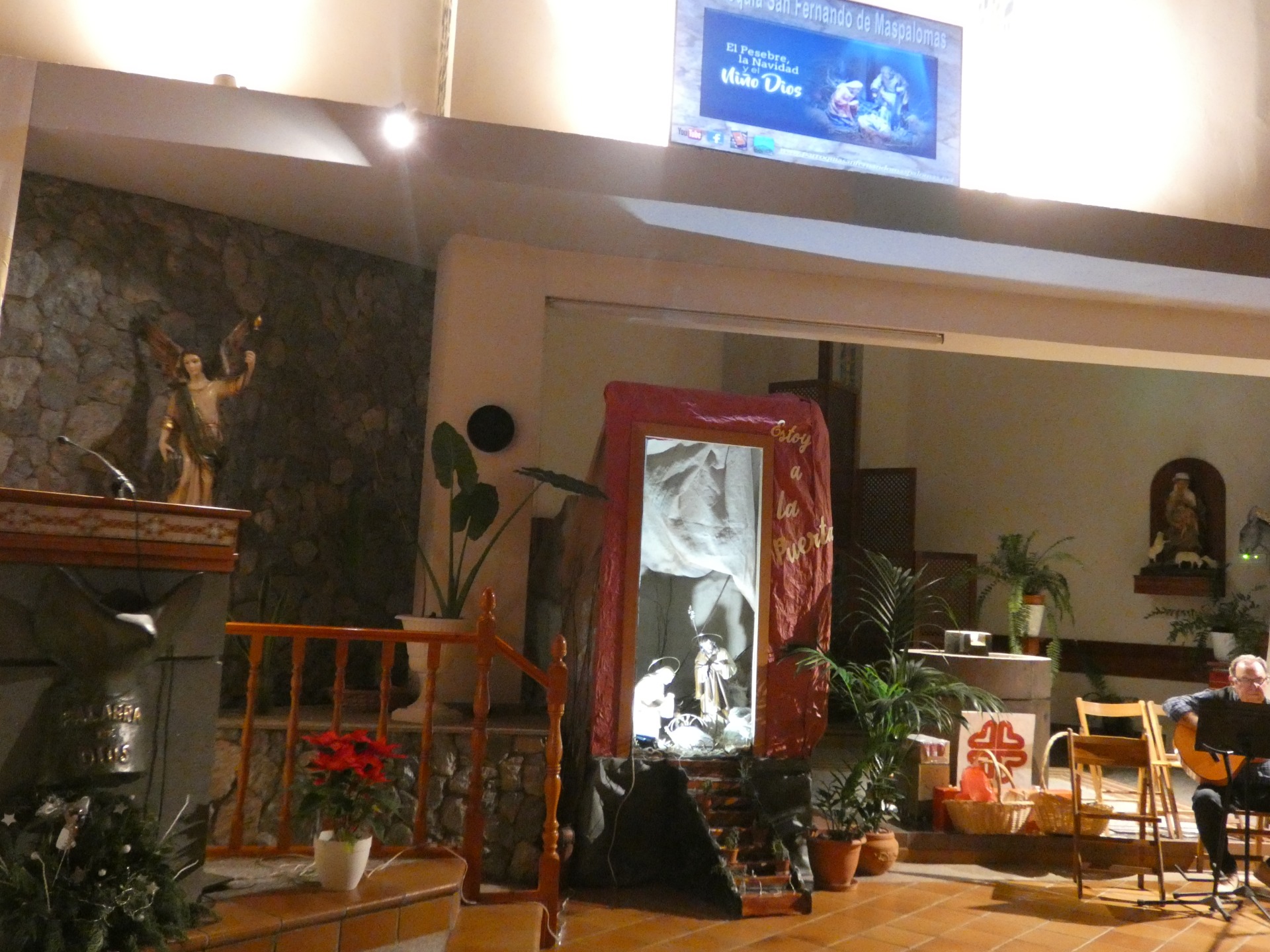 Terminada la Eucaristía, salimos a la plaza, donde, bajo la carpa fija, se bendijo el hermoso "belén", que este año nos ofreció, para su contemplación, el Iltre Ayuntamiento de San Bartolomé. Una vez bendecido cantamos todos el villancico canario "Mi tierra canaria tiene un volcán".