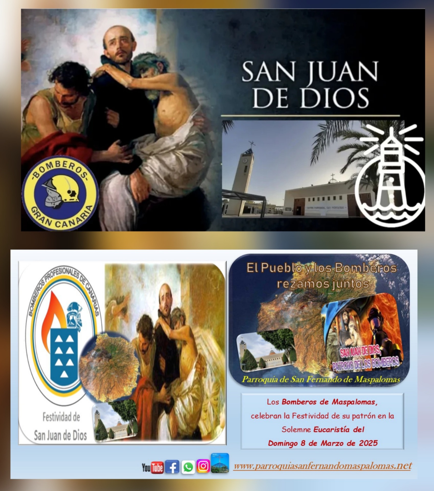 Según lo previsto, a las 11:30 de este día, 8 de marzo, celebramos la Solemne Eucaristía en honor a San Juan de Dios, bajo cuyo patronazgo están nuestros Bomberos y quienes ejercen en hospitales, clínicas privadas o públicas su noble trabajo de cuidar y atender a l@s enferm@s, y a quienes San Juan de Dios llamaba "sus privilegiados", emulando así a Jesús de Nazaret.